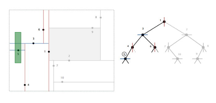- Agar yuza tekshirilayotgan nuqtaning chap yoki past tarafida bo'lsa, qidiruvni 2D tree'ning chap child'idan davom ettiriladi.