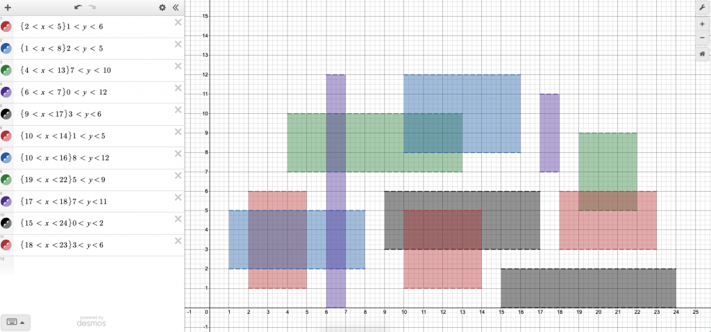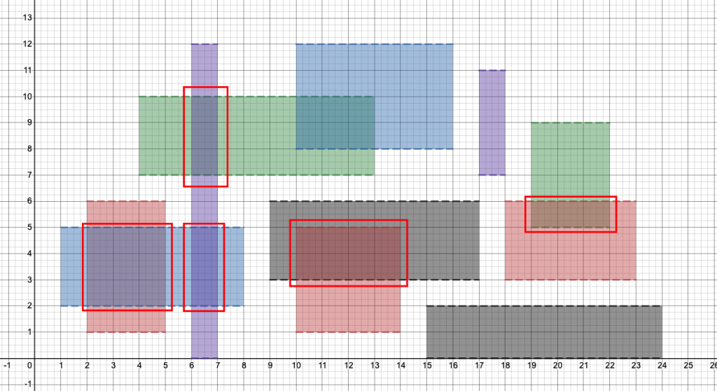 Berilgan rasmdan ko'rinib turibdiki, kesishmalar soni 6 ta. Lekin biz shartimizga ko'ra, faqat vertikal (yoki kvadrat) to'g'ri to'rtburchaklar kelganda ularning kesishmasini tekshiramiz. Ular 5ta.