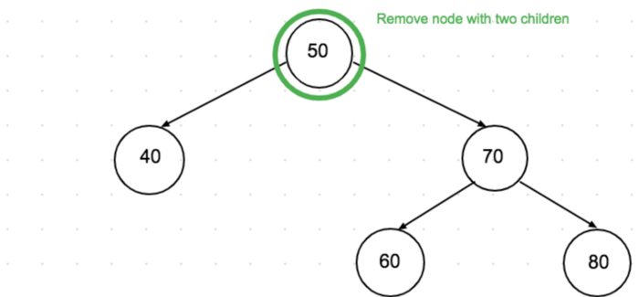O'chirilayotgan node'ning ikki child'i bor. Murakkab qismi. Dastlab, o'chirilayotgan node'ning child'lari ichidan keyingi qiymatdagi node'ni topamiz. Keyin uning qiymatini o'chirilayotgan node'ga beramiz va keyin qiymatdagi node'ni tree'dan o'chiramiz.