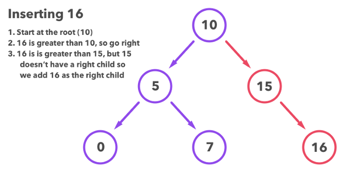 - 16 > 15, lekin 15 ning child'i yo'q. Shu sababli 16ni 15 ning child'i sifatida qo'shamiz. 16 > 15 bo'lgani uchun, 16 o'ng tarafdagi child sifatida qo'shiladi.