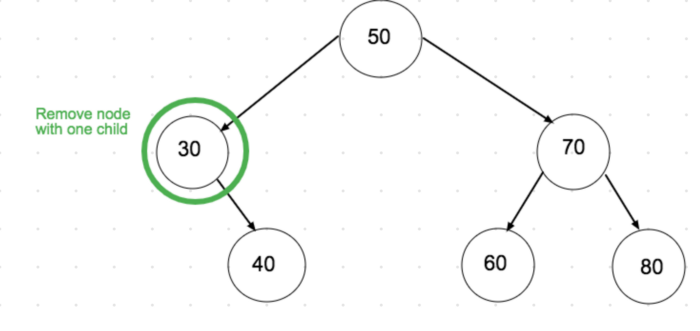 O'chirilayotgan node'ning bitta child'i bor. Bunisi ham oson, node'ning child'ini uning parent'iga beramiz.
