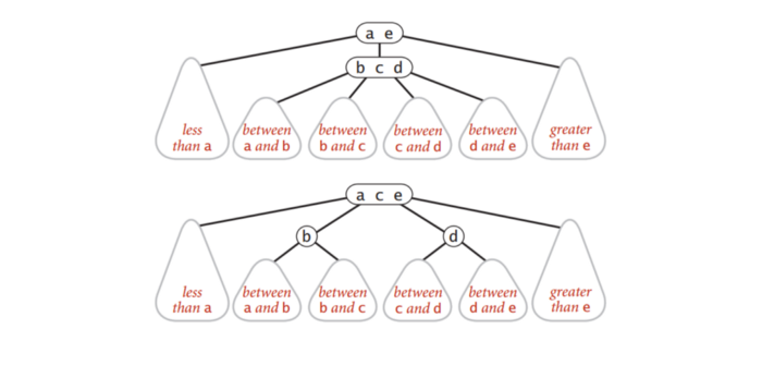 3-node. ikkita qiymat, uchta child. Chap child - parent'dagi ikki qiymatdan ham kichik; o'rtadagi child - ikki qiymat oralig'ida (kichik qiymatdan katta va katta qiymatdan kichik); o'ng child - parent'dagi ikki qiymatdan ham katta.