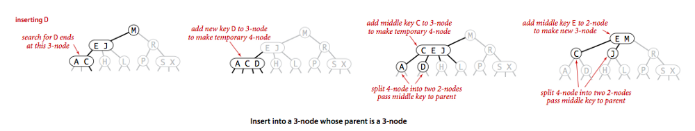 Insert (parent node'i 3-node bo'lgan 3-node). Bunda ham vaqtincha 4-node'ga aylantiramiz, keyin o'rtadagi key'ni parent'ga qo'shamiz. Parent 3-node bo'lgani uchun, yangi key qo'shilgach 4-node bo'lib qoladi. Parent uchun ham transformatsiyani - o'rtadagi key'ni parentga berish amaliyotini qo'llaymiz. Shu tariqa, 2-node'li parent'ga yetmagunimizcha yoki root'da 3-node qilmagunimizcha, 4-node'larning o'rta key'ini parentga berib boramiz.