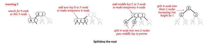 2-3 tree'da tree' uzunligi faqat root 4-node bo'lib qolgandagina bittaga oshiriladi. Bunda 4-node 3 ta 2-node'ga ajratiladi. O'rta qiymatdagi 2-node parent bo'lsa, kichigi left child, kattasi right child bo'ladi. Faqat root'dan uzunlikni oshirish bizga 2-3 tree'ning mukammal balansda qolishini ta'minlaydi.