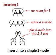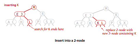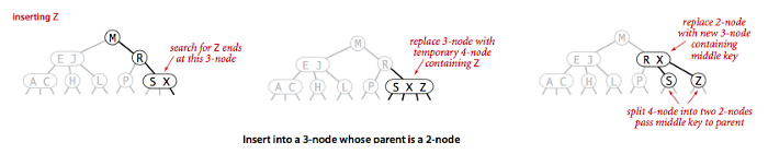 Insert (parent node'i 2-node bo'lgan 3-node). Qidiruv parenti 2-node bo'lgan 3-node'da to'xtadi. Bunday holatda ham vaqtincha 4-node'ga aylantiramiz, lekin o'rta key uchun yangi node qo'shmasdan, o'rta key'ni 2-node parent'ga qo'shamiz (Rasmda tushunarliroq).
