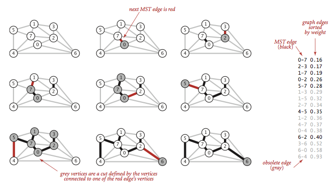 - Kichik edge'lardan boshlab, ularni graph'ga qo'shib boradi (qoraga bo'yab boradi). Agar edge qo'shilgach MSTda cycle hosil bo'lsa, edge'ni tushirib qoldiradi.