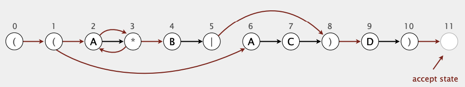 NFAning qizil (epsilon) transition'larini esa directed graph ko'rinishida saqlaymiz. Bu bizga state'larni DFSda tekshirib, qaysi path accept state'gacha borishini topish uchun qulayroq yechim. Epsilon transition'lar graph'da edge ko'rinishida, state'lar vertex ko'rinishida saqlanadi.