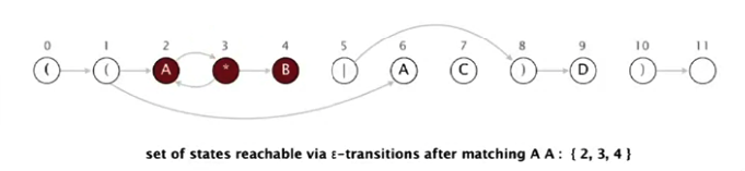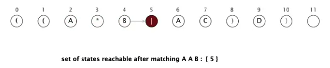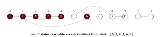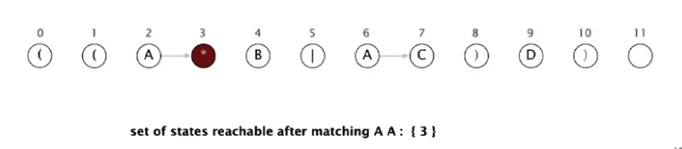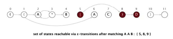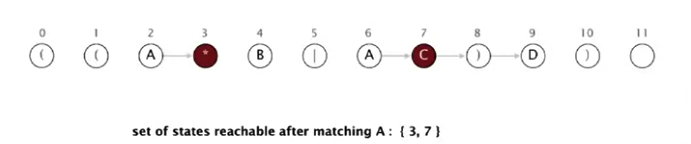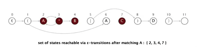 NFA simulyatsiyasida abstrakt mashinaning qanday ishlashini misol bilan ko'rib chiqamiz. Regexp o'zgarmagan - ((A*B|AC)D). Biz AABD matnni regexp'ga tekshirishni boshlaymiz.