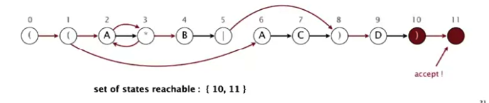 9. 10-state'dan 11-state'ga epsilon transition bor. Hozir biz 10 va 11-state'da turibmiz. 11-state accept state bo'lgani uchun simulyatsiyani to'xtatamiz.