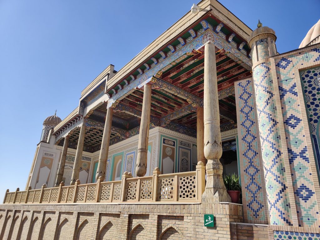 Peshinni o’qish uchun masjid qidirib, Hazrati Hizr masjidiga keldik. Eski va chiroyli kichikkina masjid Karimov qabri yonida joylashgan ekan. Ammo tahoratxona masjiddan 500 metr uzoqlikda! Masjidning gumbazi ajoyib, naqshinkor. Faqat chiqib ketayotgandagina e’tibor beribman. Rasmga olmoqchi bo’lsam, stul qo’yib kelgan-ketganni kuzatib turgan amaki mumkinmas dedi. Nega, sabab? Masjid ichida telefondan foydalanish mumkin emas ekan! 😀