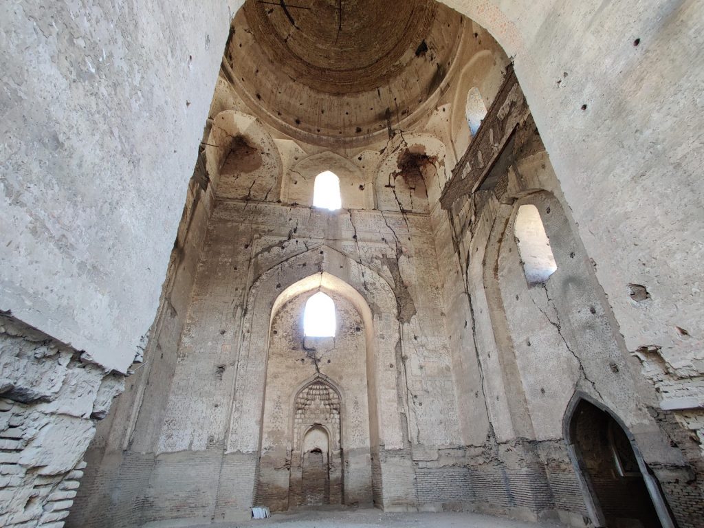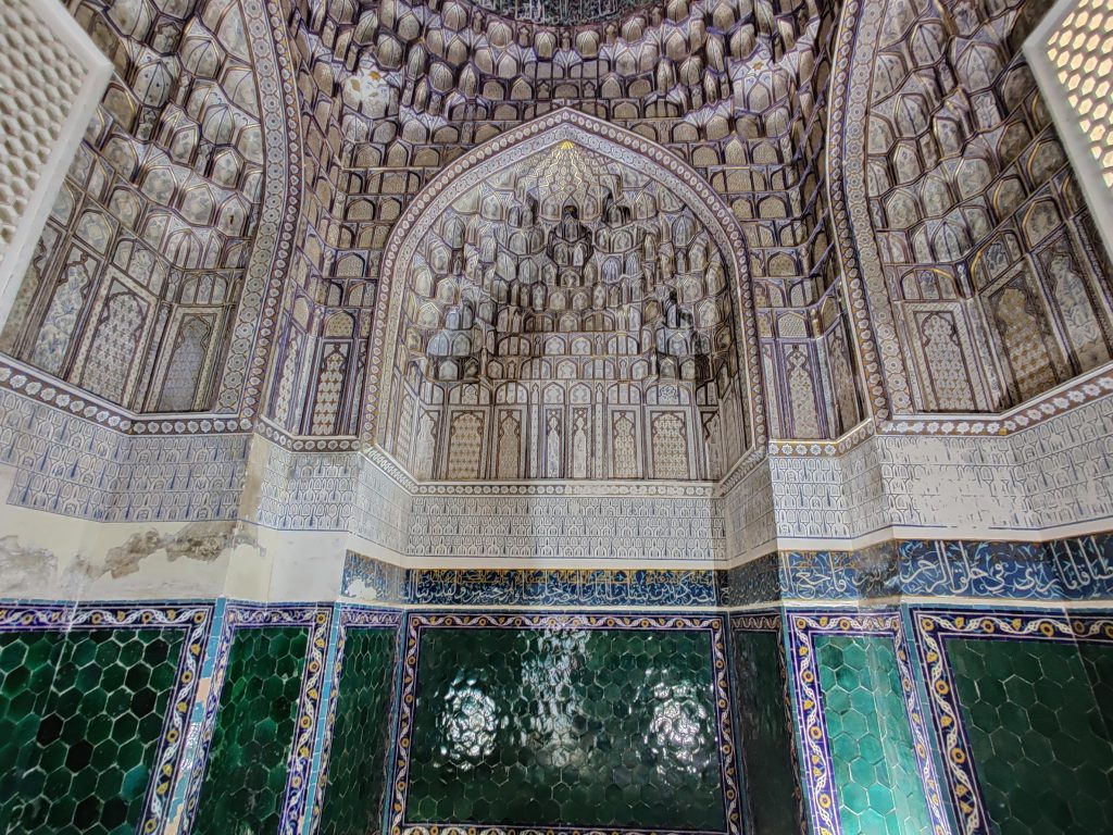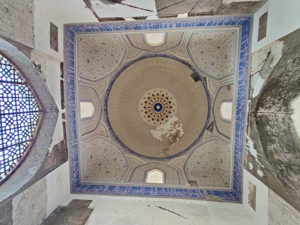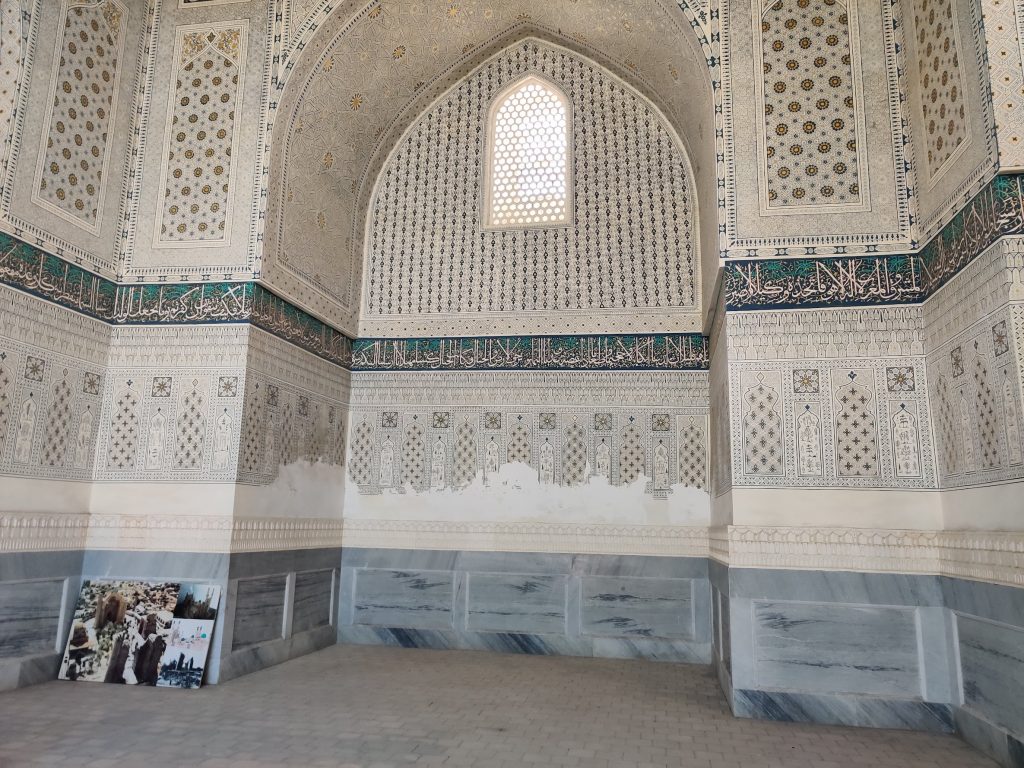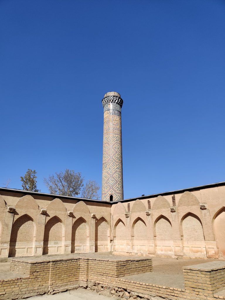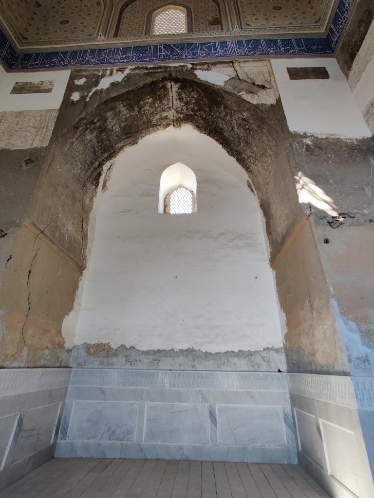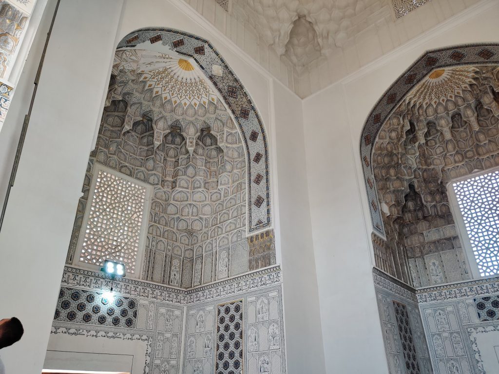 Masjid restavratsiya qilingan, eski va yangi g’ishtlar/naqshlar orasida farq ko’rinib turipti. Tushunamiz, restavratsiya qilish oson emas. Masjidni faqat chap tarafdagi binosining ichki qismi qayta ishlangan. To’g’ridagi va o’ngdagi binolariga tegilmagan. Tushunishim bo’yicha, uchala binoning hammasida ham namoz o’qilmagan. Ularning biri madrasa, yana biri karvonsaroy bo’lgan bo’lishi kerak (bu yerda gid olmaganimga afsus qildim).