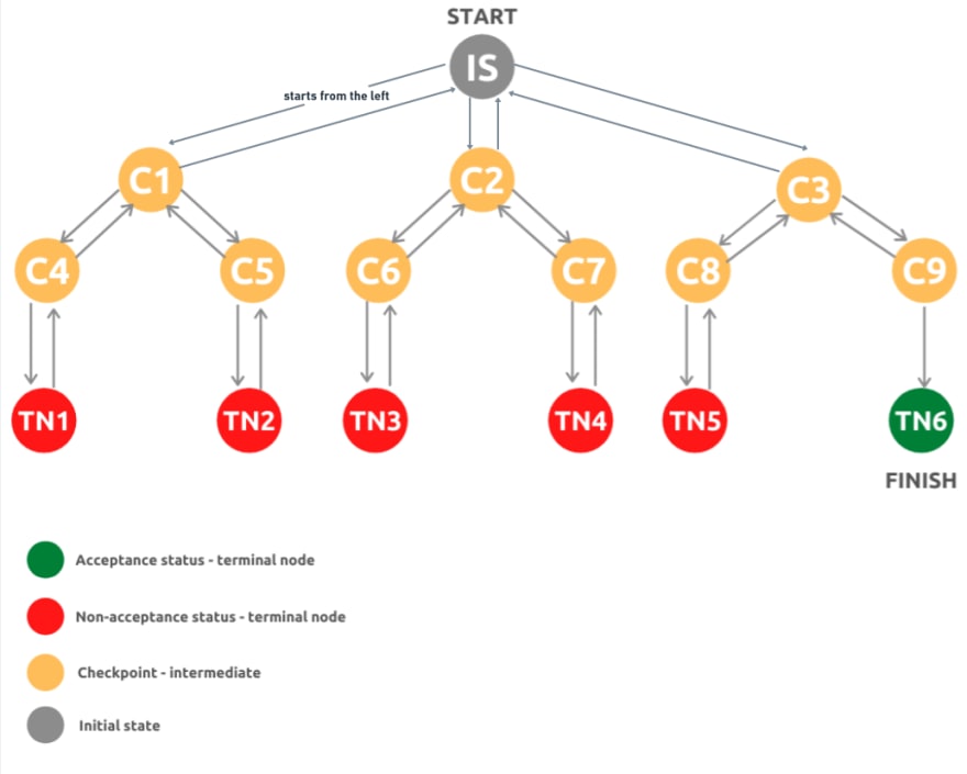 Qidiruv har doim tree'ning chap tarafidan boshlanadi va pastga qarab ketadi. Qidirilayotgan natija topilmaguncha, daraxtning barglariga yetgach, orqaga qaytib o'ng tarafdagi keyingi node'dan qidiruvni davom ettiradi.